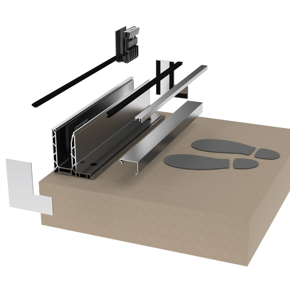 Podlahový profil pre sklenené zábradlia, model OSF. Kompaktný systém z eloxovaného hliníka, vhodný pre súkromné aj verejné použitie. Laminované sklo je upevnené pomocou klinového systému, ktorý umožňuje rýchlu montáž z jednej strany.