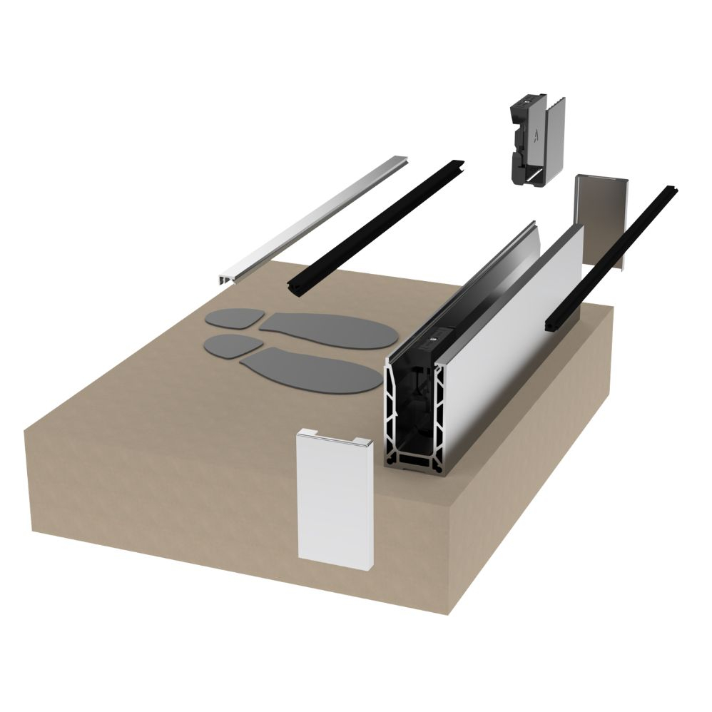 Podlahový profil pre sklenené zábradlia, model OSF. Kompaktný systém z eloxovaného hliníka, vhodný pre súkromné aj verejné použitie. Laminované sklo je upevnené pomocou klinového systému, ktorý umožňuje rýchlu montáž z jednej strany.